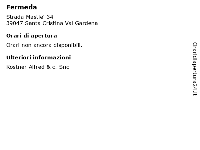 1 Rifugio Fermeda Hütte (distanza: 0,00 km) Via Mastlè 34, 39047 Santa Cristina In Val Gardena alloggio, baita, fermeda, hotel, hütte, rifugio, risto 2 Kostner Alfred & Co. Snc (distanza: 0,00 km) Strada Mastle' 58, 39047 Santa Cristina Val Gardena alfred, catering, kostner, ristoranti 3 Residence Chalet Mugun - Famiglia Kostner (distanza: 11,85 km) Strada Agà 6, 39033 Corvara in Badia alberghi, b&b, chalet, famiglia, hotel, kostner, mugun, residence 4 Kostner Sport - Nexus (distanza: 12,32 km) Via Col Alt 90, 39033 Corvara abbigliamento, camicie, kostner, nexus, pantaloni, sport, vestiti 5 TABACCHERIA KOSTNER (distanza: 12,36 km) VIA COL ALT 97, 39033 CORVARA IN BADIA kostner, scommesse, sisal, tabaccheria 6 Kostner srl (distanza: 18,41 km) Via Bsackerau 8, 39040 Varna - BZ kostner, servizi, srl, utente varie |