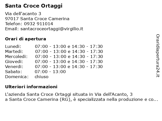 1 Sud Ortaggi di Scrofani srl (Orario Contrattazioni Invernale) (distanza: 4,57 km) Contrada Petraro , Strada Provinciale 20 (S.P.S. Croce - Comiso Km.1) snc, 97017 Santa Croce Camerina (orario, contrattazioni, di, invernale), mercato ortofrutticolo, ortaggi, ortofrutticolo, scrofani, srl, sud, verdure 2 Sud Ortaggi di Scrofani srl (Orario Contrattazioni Estivo) (distanza: 4,57 km) Contrada Petraro , Strada Provinciale 20 (S.P.S. Croce - Comiso Km.1) snc, 97017 Santa Croce Camerina (orario, contrattazioni, di, estivo), mercato ortofrutticolo, ortaggi, ortofrutticolo, scrofani, srl, sud, verdure 3 Sud Ortaggi di Scrofani Srl (distanza: 5,18 km) Strada Provinciale 20 s.n.c., 97017 Santa Croce Camerina di, frutta, ortaggi, ortofrutta, prodotti freschi, scrofani, srl, sud, verdura 4 Sicilia Ortaggi di Blandino Vincenzo (Orario Contrattazioni Estivo) (distanza: 17,52 km) Contrada Spinello snc, 97018 Donnalucata di Scicli (orario, blandino, contrattazioni, di, estivo), mercato ortofrutticolo, ortaggi, ortofrutticolo, sicilia, verdure, vincenzo 5 Sicilia Ortaggi di Blandino Vincenzo (Orario Contrattazioni Invernale) (distanza: 17,52 km) Contrada Spinello snc, 97018 Donnalucata di Scicli (orario, blandino, contrattazioni, di, invernale), mercato ortofrutticolo, ortaggi, ortofrutticolo, sicilia, verdure, vincenzo 6 Essedi Ortaggi Srl (distanza: 18,30 km) Contrada Fanello snc, 97019 Vittoria agricoltura, essedi, ingrosso, mercato, ortaggi, ortofrutta, spesa, srl |