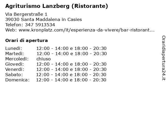 | Domenica | 12:00-14:00 e 18:00-20:30 |
