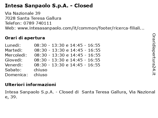 1 Intesa Sanpaolo S.p.A. (distanza: 18,52 km) Via Amendola 6/a, 07024 La Maddalena associazione di risparmio e prestito, bancomat, carte di credito, consulente finanziario, intesa, s.p.a., sanpaolo, servizi di investimento 2 Intesa San Paolo (bancomat) (distanza: 18,64 km) Via Amnedola 1, 07024 La Maddalena (bancomat), bancomat, intesa, paolo, prelievo, san, versamento 3 IQOS Summer Lounge (Permanently Closed) (distanza: 25,67 km) Località forte cappellini \ , 07021 Arzachena closed, iqos, lounge, permanently, summer 4 Banco di Sardegna (Bancomat) (distanza: 0,15 km) Via Nazionale 18, 07028 Santa Teresa di Gallura (bancomat), assegni, banca, banco, conto corrente, denaro, di, sardegna, versamenti 5 Poste Italiane (distanza: 0,17 km) Via Eleonora d'Arborea 14, 07028 Santa Teresa di Gallura aperconto, azioni, bancoposta, buoni postali fruttiferi, carta acquisti, casellario chiuso, cessione del quinto, corrispondenza inesitata, ems, fermoposta, fondi comuni, gratta e vinci, identificazione per firma digitale, inps card prodotto, ipost card, italiane, libretto risparmio ai minori, mifid, moneygram, poste 6 Banca Di Sassari (distanza: 0,70 km) Via XX Settembre 23, 07028 Santa Teresa Gallura banca, carta di credito, conto corrente, depositi, di, interessi, mutuo, prelievi, prestito, sassari, soldi |