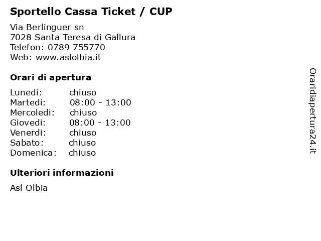 1 Sportelli Cassa Ticket / Cup (distanza: 4,98 km) Via Berlinguer s.n.c., 07028 Santa Teresa di Gallura ambulatorio, assistenza, cassa, cup, cure mediche, sanità, servizi ai cittadini, sportelli, ticket 2 Asl Olbia (Centro Unico di Prenotazione - Cassa Ticket) (distanza: 15,66 km) Via Ammiraglio Magnaghi snc, 07024 La Maddalena OT (centro, asl, asl olbia poliambulatori, cassa, di, olbia, poliambulatorio cup ticket la maddalena, prenotazione, ticket), unico 3 Asl Olbia (Centro Unico di Prenotazione - CUP) (distanza: 19,59 km) Via Jaseppa di Scanu snc, 07021 Arzachena OT (centro, asl, asl olbia prenotazione visite, cup arzachena asl olbia, cup), di, olbia, prenotazione, unico 4 Sportelli Cassa Ticket / Cup (distanza: 35,28 km) Via G. Deledda 19, 07029 Tempio Pausania ambulatorio, assistenza, cassa, cup, cure mediche, sanità, servizi ai cittadini, sportelli, ticket 5 Sportelli Cassa Ticket / Cup (distanza: 36,93 km) Viale Aldo Moro s.n.c., 07026 Olbia ambulatorio, assistenza, cassa, cup, cure mediche, sanità, servizi ai cittadini, sportelli, ticket 6 Sportelli Cassa Ticket / Cup (distanza: 38,37 km) Via Bazzoni Sircana s.n.c., 07026 Olbia ambulatorio, assistenza, cassa, cup, cure mediche, sanità, servizi ai cittadini, sportelli, ticket |