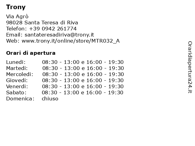 1 Trony (distanza: 12,87 km) Via Umberto 435, 98035 Giardini Naxos eletronica, informatica, telefonia, trony 2 Trony (distanza: 14,93 km) Via Cannamelli 18, 98035 Giardini Naxos domestici, elettro, piccoli, radio, trony 3 Trony (distanza: 26,92 km) Via Fondaco Nuovo s.n.c., 98051 Barcellona Pozzo di Gotto articoli per la casa, assistenza, casalinghi, computers, elettrodomestici, elettronica, telefonia, trony, tv, vendita 4 6 Trony (distanza: 29,37 km) Viale Europa s.n.c., 98040 Torregrotta eletronica, informatica, telefonia, trony |