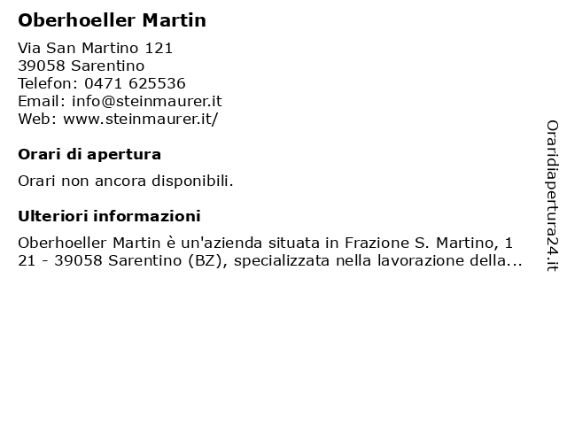 2 Panorama Sas Di Berger Martin & c. (distanza: 13,65 km) Via Falzeben 209, 39010 Avelengo alimentari, berger, comm, dett, martin, panorama, prod, vari 3 Martin’s Getränkemarkt - Il mercatino delle bevande Martin's Chiusa (distanza: 13,76 km) Località San Giuseppe 26, 39043 Chiusa (BZ) alcolici, bevande, bibite, bicchieri, birre, chiusa, cubetti di ghiaccio confezionati, delle, getränkemarkt, gruppi di tavoli e panche, il, impianti per la spillatura della birra, martin's, martin’s, mercatino, spumanti, tavoli alti, vini 4 Comune di Laion - Orario Ricevimento Vikoler Martin (Vicesindaco) (distanza: 15,57 km) Via Walther von der Vogelweide 30/A, 39040 Laion (vicesindaco), comune, di, laion, martin, orario, ricevimento, servizi comunali, uffici comunali, vikoler 5 Comune di Tesimo - Orario Ricevimento Geom. Masoner Martin (Tecnico comunale) (distanza: 17,47 km) Via Municipio 80, 39010 Tesimo (tecnico, comunale), comune, di, geom., martin, masoner, orario, ricevimento, servizi comunali, tesimo, uffici comunali 6 Gufler Martin Confezioni (distanza: 17,58 km) Via Dei Carbonai 9, 39015 San Leonardo In Passiria acquisti, confezioni, convenienza, gufler, martin, negozi, shopping, spesa |