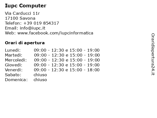 | Venerdi | 09:00-12:30 e 15:00-18:00 |