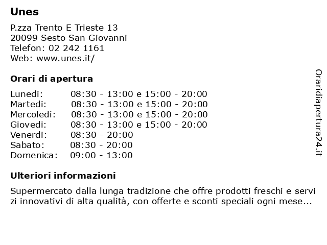 1 Unes (distanza: 0,02 km) Piazza Trento e Trieste 13, 20099 Sesto San Giovanni alimentari, carne, ortofrutta, u!, unes 2 Unes (distanza: 3,04 km) Via XXV Aprile 103, 20092 Cinisello Balsamo alimenti, articoli vari, carne, frutta, igiene casa, igiene della persona, market, punto, simply, spesa, supermercato, unes, verdura 4 Unes (distanza: 5,43 km) Piazza Aspromonte 28, 20131 Milano acqua, alimentari, carne, frutta, pesce, unes 5 Unes (distanza: 6,33 km) Via Morgagni 10, 20129 Milano (MI) alimentari biologici, bio, bon, c', cibi naturali, unes 6 |