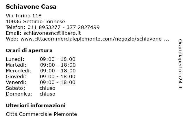 2 Schiavone Walter (distanza: 6,49 km) Via Conte Di Roccavione 50, 10147 Torino agenti, assicuraz, schiavone, serv, walter 3 Schiavone Cosima Cinzia (distanza: 7,52 km) Via Giuseppe Verdi 3, 10088 Volpiano art, casa, cinzia, comm, cosima, dett, schiavone, vari 4 Schiavone s.n.c. Di Schiavone Armando e c. (distanza: 9,50 km) Via Principe Tommaso 17, 10125 Torino armando, catering, ristoranti, schiavone 5 Avvocato Schiavone Marco Maria (distanza: 9,54 km) Corso Stati Uniti 6, 10128 Torino avvocati, avvocato, legge, marco, maria, schiavone, studio legale, tribunale 6 Avvocato Schiavone Agnese Barbara (distanza: 9,75 km) Via Cialdini 36, 10138 Torino agnese, avvocati, avvocato, barbara, legge, schiavone, studio legale, tribunale |