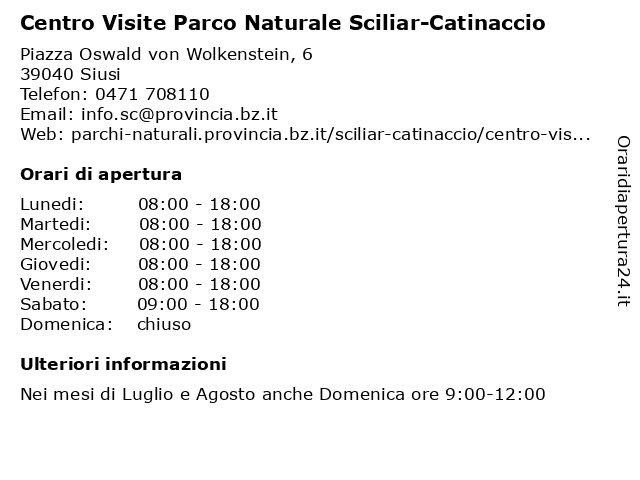 1 Centro visite Parco Naturale Sciliar-Catinaccio (distanza: 8,80 km) Località Bagni di Lavina Bianca 14, 39100 Tires catinaccio, centro, naturale, parco, sciliar, turismo, viaggi, visite 2 Piccolo Hotel Sciliar (distanza: 4,51 km) Via Compatsch 52, 39040 Alpe di Siusi hotel, piccolo, sciliar 3 Casa di Riposo Fie Allo Sciliar (distanza: 5,28 km) via Kartatscher 2, 39050 Fié allo, casa, fie, riposo, sciliar 4 Centro visite Sciliar-Catinaccio,dal 7 giugno sino al 15 ottobre (distanza: 8,81 km) Bagni di Lavina Bianca SNC, 39050 Tires (BZ) 15, al, assistenza, catinaccio, centro, dal, giugno, ottobre, sciliar, servizi, sino, visite 5 Centro visite Sciliar-Catinaccio,dal 7 giugno sino al 15 ottobre (distanza: 8,81 km) Bagni di Lavina Bianca SNC, 39050 Tires (BZ) 15, al, assistenza, catinaccio, centro, dal, giugno, ottobre, sciliar, servizi, sino, visite 6 Parco avventura Col de Flam ,14.06.2016 - 16.09.2016 (distanza: 9,25 km) Piazza Stetteneck 5, 39040 Ortisei 14.06.2016, 16.09.2016, avventura, col, de, flam, parco, sport, tempo libero |