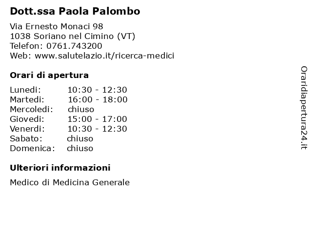 1 Dott.ssa Paola Palombo (distanza: 12,92 km) Via Gramsci 66, 01028 Orte (VT) ambulatori, analisi, cura della persona, cure, dott.ssa, medici, medicina, palombo, paola, sanità, visite mediche 2 Sofim Snc Di Palombo Mauro e Fatutto Ida (distanza: 32,84 km) Largo Mazziotti 4, 01023 Bolsena catering, fatutto, ida, mauro, palombo, ristoranti, sofim 3 Rare Aquatic Plants di Daniela Palombo (distanza: 49,89 km) Via Garigliano 199, 00015 Monterotondo aquatic, catalogo, corrispond, daniela, di, palombo, plants, rare, vendite 4 Farmacia Palombo Di Palombo Vincenzo (distanza: 51,69 km) Via Del Corso 24, 00053 Civitavecchia erboristerie, farmacia, farmacie, palombo, profumerie, vincenzo 5 Palombo Paolo (distanza: 51,88 km) Via Arturo Toscanini 76, 00052 Cerveteri consulenze, finanziarie, palombo, paolo 6 Palombo Mauro (distanza: 54,67 km) Via Aurelia Km 30 400, 00054 Fiumicino bar, birrerie, mauro, palombo, paninoteche |