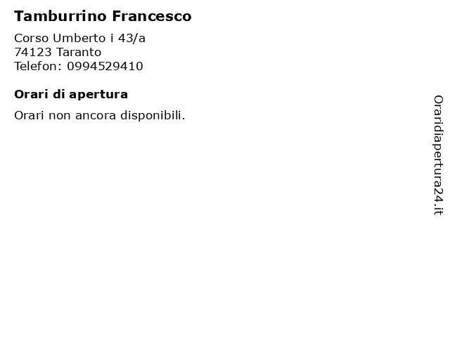 1 Tamburrino Valentina (distanza: 0,55 km) Via Principe Amedeo 70/a, 74123 Taranto articoli, comm, dett, tamburrino, valentina, vari 2 Tamburrino Cataldo (distanza: 11,44 km) Zona Gandoli, 74020 Leporano benzina, cataldo, distributori, tamburrino 3 Notaio Michele Venusio Tamburrino (distanza: 14,61 km) Via Roma 15, 74012 Crispiano contratti, eredità, michele, notai, notaio, pratichevia vincenzo chiaia, raffaele, tamburrino, venusio 4 Studio Tecnico Geometra Geometra Franco Tamburrino (distanza: 30,18 km) Viale Virgilio 53, 74025 Marina di Ginosa amministrazione, franco, geom, geometra, geometri, studio, tamburrino, tecnico 5 Metal Strutture di Angelo Tamburrino (distanza: 30,88 km) Contrada Specchia s.n.c, 74011 Castellaneta angelo, demolizione, di, ferro, metal, metalli, metallurgica, recupero metalli, strutture, tamburrino 6 Tamburrino Vivai (distanza: 34,69 km) Contrada Padreterno Snc, 72021 Francavilla Fontana azienda, cliente, fabbrica, tamburrino, vendite, vivai |
