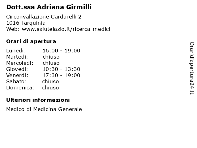 1 Dr.ssa Girmilli Adriana (distanza: 0,17 km) Via Tagete 23, 01016 Tarquinia (VT) adriana, ambulatori, circoscrizione, dottore, dr.ssa, girmilli, guarigione, medico di base, medico di famiglia, pediatra, studi, visita 2 La Casa Del Corredo Di Biondo Adriana (distanza: 15,97 km) Via Roma 62, 00051 Allumiere abbigl, adriana, biondo, casa, comm, corredo, dett, genere 3 Ciminelli Adriana (distanza: 17,75 km) Via Agricoltori 26, 00053 Civitavecchia adriana, ciminelli, coloniali, drogherie 4 Villa Adriana Srl - Rsa Semiresidenziale (distanza: 17,82 km) Via Etruria 19/23, 00053 Civitavecchia adriana, azienda, cliente, fabbrica, rsa, semiresidenziale, srl, vendite, villa 5 Pizzeria Dall'Adriana Snc Di Perfetti Rosella e Ricci Raffaella (distanza: 18,70 km) Via Roma 154, 00059 Tolfa adriana, catering, perfetti, pizzeria, raffaella, ricci, ristoranti, rosella 6 Antico Forno (distanza: 12,04 km) Via Vittorio Emanuele 22, 01010 Monte Romano adriana, antico, fiorucci, forno, pane, rivend |