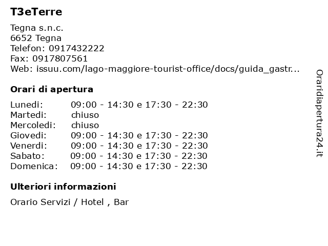 | Lunedi | 09:00-14:30 e 17:30-22:30 |