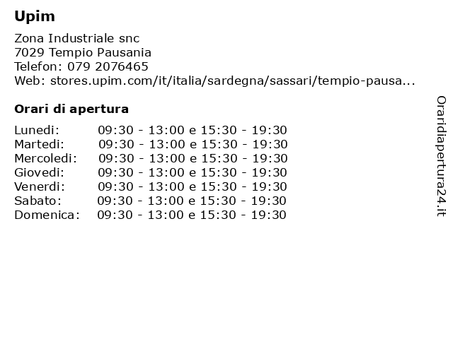 2 Upim (distanza: 24,17 km) Corso Europa 114, 07039 Valledoria abbigliamento, moda, negozio abbigliamento, scarpe, upim 3 Crai Upim (distanza: 30,90 km) Zin Localita'Malgianu Settore 1, 07021 Arzachena crai, dettori, market, supermercati, upim 6 Rinascente Upim Srl (distanza: 51,70 km) Zona Industriale Predda Niedda Sud 1, 07100 Sassari grandi, magazzini, rinascente, upim |