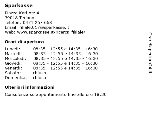 1 Sparkasse (distanza: 5,71 km) Via Lorenz Böhler 5, 39100 Bolzano (BZ) assegni, banca, cassa, conto corrente, di, risparmio, servizi finanziari, soldi, sparkasse 2 Sparkasse (distanza: 6,85 km) Via Resia 20/i, 39100 Bolzano (BZ) assegni, banca, cassa, conto corrente, di, risparmio, servizi finanziari, soldi, sparkasse 3 Sparkasse (distanza: 7,36 km) Corso Libertà 84, 39100 Bolzano (BZ) assegni, banca, cassa, conto corrente, di, risparmio, servizi finanziari, soldi, sparkasse 4 Sparkasse (distanza: 7,57 km) Via Duca d'Aosta 57, 39100 Bolzano (BZ) (cassa, assicurazioni, azioni, banca, banca sparkasse, bancario, banche, banking, belluno, beni, bolzano, business, card, casa, cassa, cassa di risparmio, cassa di risparmio sparkasse, di, risparmio, sparkasse 5 Sparkasse (distanza: 8,13 km) Via Roma 42, 39100 Bolzano (BZ) assegni, banca, cassa, conto corrente, di, risparmio, servizi finanziari, soldi, sparkasse 6 Sparkasse (distanza: 8,26 km) Via Cassa di Risparmio 12, 39100 Bolzano (BZ) assegni, banca, cassa, conto corrente, di, risparmio, servizi finanziari, soldi, sparkasse |