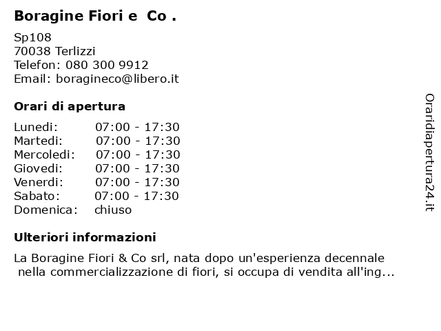 1 Flor De Palma di De Chirico Francesco - Piante & Fiori (distanza: 1,75 km) Strada Provinciale 107 11, 70038 Terlizzi acquisti, chirico, de, di, fiori, fiorista, flor, francesco, palma, piante, servizio di organizzazione matrimoni, vendita al dettaglio 2 B&B Fiori d'Arancio (distanza: 1,80 km) Via Poerio 73, 70038 Terlizzi b&b, camere, d'arancio, fiori, pernottamenti, turismo, vacanze 3 Boragine Luciano Ingrosso Fiori e Piante (distanza: 1,95 km) Via Balbo snc, 70038 Terlizzi acquisti, boragine, convenienza, fiori, ingrosso, luciano, mercato, piante, shopping, spesa 4 Mercato dei Fiori (distanza: 1,95 km) Via Balbo snc, 70038 Terlizzi acquisti, convenienza, dei, fiori, mercato, shopping, spesa 5 Puglia Fiori di D’Elia Michele (distanza: 1,95 km) Via Balbo snc, 70038 Terlizzi acquisti, convenienza, di, d’elia, fiori, mercato, michele, puglia, shopping, spesa 6 Grieco Francesco Ingrosso Fiori e Piante (distanza: 1,95 km) Via Balbo snc, 70038 Terlizzi acquisti, convenienza, fiori, francesco, grieco, ingrosso, mercato, piante, shopping, spesa |