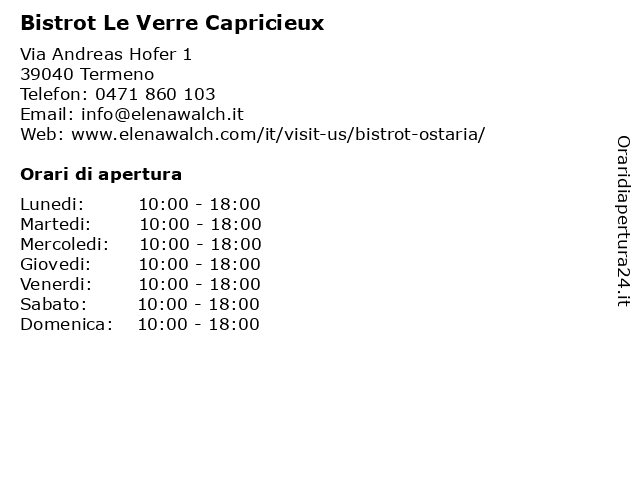 1 El Molin Winebar & Bistrot (distanza: 17,75 km) Via Muratori 6, 38033 Cavalese bar, bistrot, caffè, dolci, el, molin, pizzeria, winebar 2 Thaler -*arome café bistrot (distanza: 19,94 km) Via Portici 69, 39100 Bolzano *arome, bistrot, café, concept, profumeria, store, thaler 3 Ristorante Weis Keller (Marzo - Ottobre) (distanza: 0,11 km) Via Julius v. Payer 29, 39040 Termeno (marzo, bar, bere, caffetteria, keller, locale, mangiare, ottobre), ristorante, stuzzicheria, weis 4 Ristorante Weis Keller (Agosto - Settembre) (distanza: 0,11 km) Via Julius v. Payer 29, 39040 Termeno (agosto, bar, bere, caffetteria, keller, locale, mangiare, ristorante, settembre), stuzzicheria, weis 5 Ristorante Da Candido (distanza: 3,97 km) Piazza 1 snc, 39044 Egna bar, bere, caffetteria, candido, da, locale, mangiare, ristorante, stuzzicheria 6 Albergo Ristorante Torgglhof (distanza: 4,39 km) Via Kauderle 6, Penone, 39040 Cortaccia sulla Strada del Vino albergo, bar, bere, caffetteria, camere, locale, mangiare, ristorante, stuzzicheria, torgglhof |