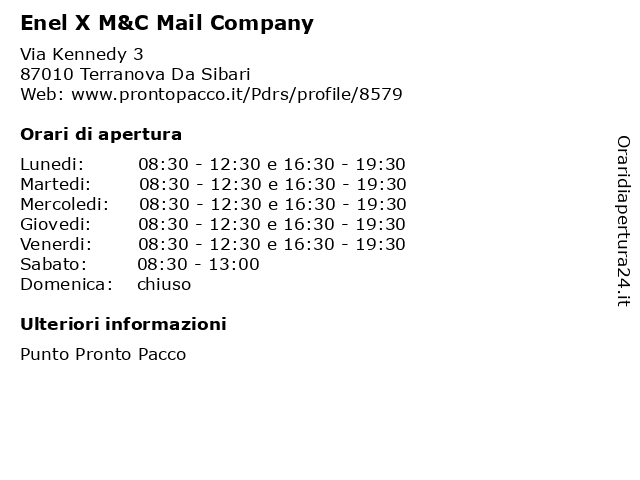 2 Punto Enel (distanza: 2,85 km) VIA LOCRI SNC, 87064 SPEZZANO ALBANESE allacci, elettricità, enel, energia, punto 3 Spazio Enel Partner (distanza: 13,43 km) Via Sibari 56, 87011 Cassano All'Ionio enel, energia, gas, luce, partner, people, smart, spazio 4 Mail Boxes Etc. (distanza: 15,05 km) Via Foscolo s.n.c., 87064 Corigliano Calabro (CS) boxes, corriere, etc., mail, mail boxes, pacchi, posta, spedizioni 5 Mail Boxes Etc. - Centro MBE 2790 (distanza: 15,56 km) Via Walt Disney snc, 87064 Corigliano Calabro 2790, boxes, centro, etc., mail, mbe, negozi di forniture per il confezionamento, stampe commerciali 6 Spazio Enel Partner (distanza: 15,69 km) Via Provinciale 49 H, 87067 Corigliano Calabro c., enel, energia, gas, luce, p&m, parigino, partner, rosa, spazio |