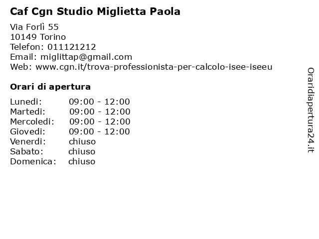 | Giovedi | 09:00-12:00 |