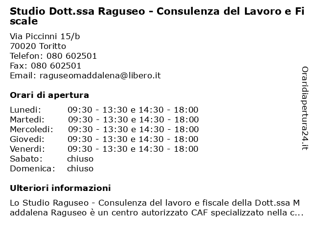 | Lunedi | 09:30-13:30 e 14:30-18:00 |