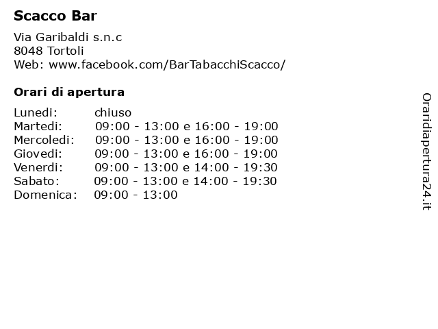 | Sabato | 09:00-13:00 e 14:00-19:30 |