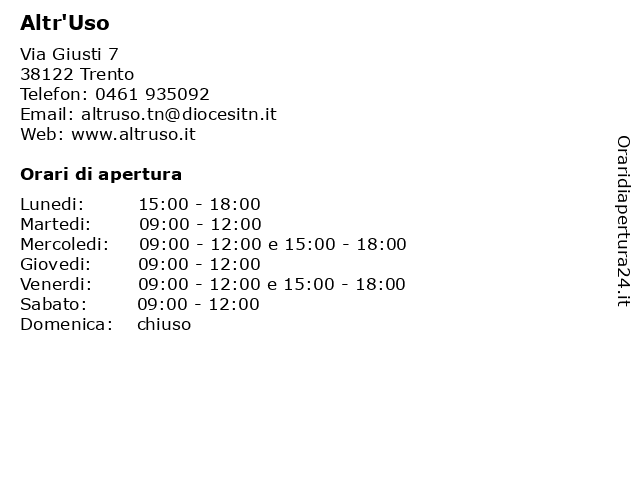 | 1 Altr'Uso (distanza: 19,72 km) Via Indipendenza 3, 38068 Rovereto abbigliamento, accompagnamento ai servizi, aiuto ai bisognosi, aiuto materiale, alimenti, altr'uso, ascolto, mensa, pasti caldi, riutilizzo, sussidi, usato, vestiario, volontariato 2 Caritas Diocesana Trento (Segreteria Centro di Ascolto) (distanza: 0,03 km) Via Giusti 11, 38122 Trento (segreteria, accompagnamento ai servizi, aiuto ai bisognosi, aiuto materiale, alimenti, ascolto, ascolto), caritas, centro, di, diocesana, mensa, pasti caldi, sussidi, trento, vestiario, volontariato 3 Caritas Diocesana Trento (Sportello Credito Solidale) (distanza: 0,03 km) Via Giusti 11, 38122 Trento (sportello, accompagnamento ai servizi, aiuto ai bisognosi, aiuto materiale, alimenti, ascolto, caritas, credito, diocesana, mensa, pasti caldi, solidale), sussidi, trento, vestiario, volontariato 4 Caritas Diocesana Trento (Uffici) (distanza: 0,64 km) Via S.Giovanni Bosco 7, 38122 Trento (uffici), accompagnamento ai servizi, aiuto ai bisognosi, aiuto materiale, alimenti, ascolto, caritas, diocesana, mensa, pasti caldi, sussidi, trento, vestiario, volontariato 5 Volontariato Trentino (distanza: 0,88 km) Piazzetta Leonardo Da Vinci 2, 38122 Trento accompagnamento ai servizi, aiuto ai bisognosi, aiuto materiale, alimenti, ascolto, mensa, pasti caldi, sussidi, trentino, vestiario, volontariato 6 Caritas Diocesana Trento (Sportello Credito Solidale) (distanza: 9,52 km) Via Baratieri 1, 38057 Pergine Valsugana (sportello, accompagnamento ai servizi, aiuto ai bisognosi, aiuto materiale, alimenti, ascolto, caritas, credito, diocesana, mensa, pasti caldi, solidale), sussidi, trento, vestiario, volontariato |