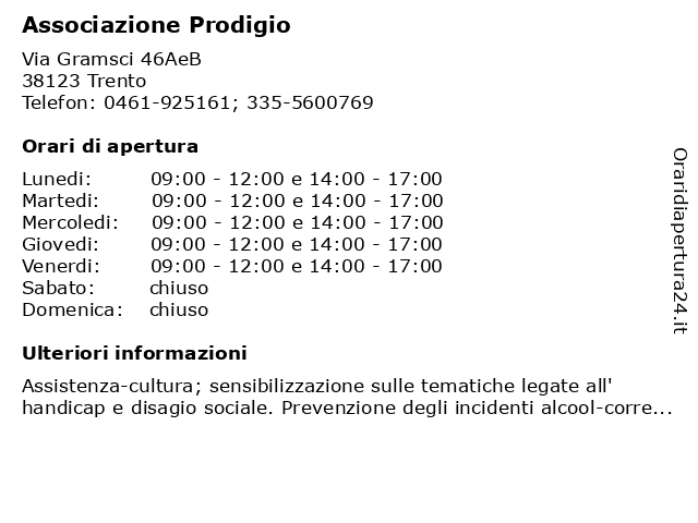 | Lunedi | 09:00-12:00 e 14:00-17:00 |