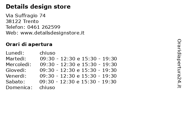 1 Details Design Store (distanza: 0,05 km) Via Suffragio 74, 38122 Trento design, details, mobili, negozio, store 2 Serafini Design (distanza: 0,20 km) Via Torre Verde 2, 38100 Trento arredamento, design, mobili, negozio, serafini, vendita 4 Luce e Design Habitat (distanza: 0,54 km) Via Pilati 7, 38122 Trento arredamenti, design, habitat, illuminazone, luce, mobili 5 Vivere Interior Design (distanza: 0,76 km) Via Antonio Da Trento 8/2, 38122 Trento design, designer, interior, interni, vivere 6 Oro Design Di Lanzavecchia Marco (distanza: 1,09 km) Via Fratelli Perini 48, 38100 Trento design, gioiellerie, lanzavecchia, marco, oro |