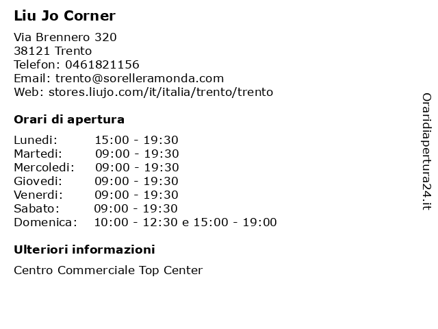 2 Pet Corner (distanza: 2,22 km) Via Santi Cosma e Damiano 64, 38121 Trento accessori, animali, cibo, corner, pet, trattamenti, vendita 3 Sorelle Ramonda Corner Tutto (distanza: 2,86 km) Piazza Battisti 21, 38122 Trento abbigliamento, corner, negozio, ramonda, sorelle, tutto 4 Montura Corner (distanza: 5,15 km) Via Enrico Fermi 13/2, 38122 Trento abbigliamento sportivo, attrezzatura per l’arrampicata sportiva, attrezzatura tecnica, corner, laboratorio, montura, zaini 6 Liu Jo Corner (distanza: 24,32 km) Via Maioliche 53, 38068 Rovereto abbigliamento, corner, donna, jo, liu, uomo, vip |
