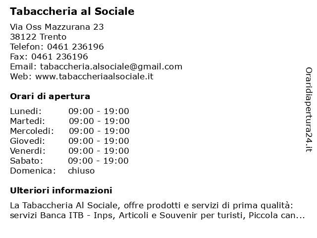 | Lunedi | 09:00-19:00 |