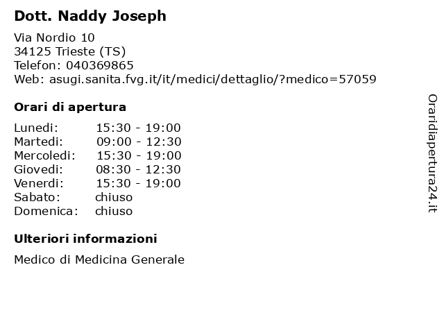 1 Dott. Naddy Joseph (distanza: 4,09 km) Via Aurelio e Fabio Nordio 10, 34125 Trieste (TS) ambulatori, circoscrizione, dott., dottore, dr., guarigione, joseph, medico di base, medico di famiglia, naddy, pediatra, studi, visita 2 Studio Dentistico Dr. Joseph Naddy (distanza: 0,01 km) Via Nordio Aurelio e Fabio 10, 34125 Trieste dentista, dentisti medici chirurghi ed odontoiatri, dentistico, dr., joseph, naddy, studio 3 Dott. Battigelli Vitaliano (distanza: 1,21 km) Via Fabio Severo 122, 34100 Trieste (TS) ambulatori, battigelli, circoscrizione, dott., dottore, dr., guarigione, medico di base, medico di famiglia, pediatra, studi, visita, vitaliano 4 Battigelli Dr. Doriano - Cardiologo e Medico dello Sport (distanza: 1,65 km) Via Belpoggio 4, 34123 Trieste battigelli, cardiologo, dello, doriano, dr., medicina sportiva, medico, sport 5 Pais Snc Di Gambino Joseph & Speranza Alessandro (distanza: 32,26 km) Via Iii Armata 28/3, 34070 Fogliano Redipuglia abbigl, alessandro, comm, dett, gambino, genere, joseph, pais, speranza 6 Immanuel Joseph (distanza: 50,15 km) Via Principale 19, 33044 Manzano art, casa, comm, dett, immanuel, joseph, vari |