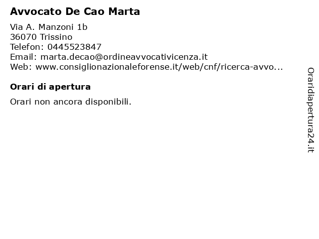 1 Onoranze Funebri De Cao (distanza: 0,15 km) Via Delle Ore 71, 36070 Trissino cao, de, funebri, onoranze, onoranze funebrimoto 3 Cartoleria De Cao Anna Donatella (Rivendita Ferrovie Tramvie Vicentine) (distanza: 0,48 km) Via Roma 31, 36070 Trissino (rivendita, anna, autobus, biglietteria, biglietti, bus, cao, cartoleria, de, donatella, ferrovie, rivendita, tramvie, trasporti, vaibus, vicentine) 4 Impresa Edile De Cao (distanza: 0,48 km) Via Roma 33, 36070 Trissino amplifon, cao, de, edile, impresa, servizi, utente, varie 5 De Cao Andrea (distanza: 2,51 km) Via Giuseppe Mazzini 1, 36070 Trissino andrea, calzature, cao, de, moda, negozio, scarpe 6 De Cao Gianfranco (distanza: 4,73 km) Piazzale Vittoria 16, 36071 Arzignano articoli, comm, dett, gianfranco, vari |