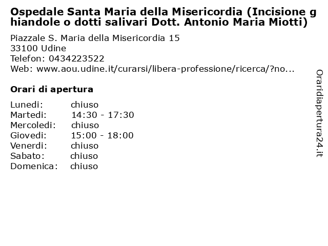 1 Ospedale Santa Maria della Misericordia (Incisione ghiandole o dotti salivari Dott. Francesco Polini) (distanza: 0,00 km) Piazzale S. Maria della Misericordia 15, 33100 Udine (incisione, della, dott., dotti, francesco, ghiandole, maria, medici, misericordia, ospedale, polini), salivari, salute, santa 2 Ospedale Santa Maria della Misericordia (Ecografia ghiandole salivari Dott.ssa Alessandra Rigamonti) (distanza: 0,00 km) Piazzale S. Maria della Misericordia 15, 33100 Udine (ecografia, alessandra, della, dott.ssa, ghiandole, maria, medici, misericordia, ospedale, rigamonti), salivari, salute, santa 3 Azienda Ospedaliero-Universitaria “Santa Maria della Misericordia (Esami laboratorio) (distanza: 0,00 km) Piazzale Santa Maria della Misericordia 15, 33100 Udine (esami, ambulatori, azienda, della, laboratorio, laboratorio), maria, misericordia, ospedaliero, salute, universitaria, “santa 4 Ospedale Santa Maria della Misericordia (Agopuntura per anestesia) (distanza: 0,00 km) Piazzale S. Maria della Misericordia 15, 33100 Udine (agopuntura, anestesia), della, maria, medici, misericordia, ospedale, per, salute, santa 5 Ospedale Santa Maria della Misericordia (Scintigrafia epatobiliare, fegato e colecisti) (distanza: 0,00 km) Piazzale S. Maria della Misericordia 15, 33100 Udine (scintigrafia, colecisti), della, epatobiliare, fegato, maria, medici, misericordia, ospedale, salute, santa 6 Ospedale Santa Maria della Misericordia (Neuroradiologia) (distanza: 0,00 km) Piazzale S. Maria della Misericordia 15, 33100 Udine (neuroradiologia), della, maria, medici, misericordia, ospedale, salute, santa |