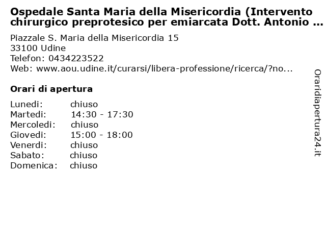 1 Ospedale Santa Maria della Misericordia (Intervento chirurgico preprotesico Dott. Francesco Polini) (distanza: 0,00 km) Piazzale S. Maria della Misericordia 15, 33100 Udine (intervento, chirurgico, della, dott., francesco, maria, medici, misericordia, ospedale, polini), preprotesico, salute, santa 2 Ospedale Santa Maria della Misericordia (Controllo chirurgico) (distanza: 0,00 km) Piazzale S. Maria della Misericordia 15, 33100 Udine (controllo, chirurgico), della, maria, medici, misericordia, ospedale, salute, santa 3 Ospedale Santa Maria della Misericordia (Controllo chirurgico Prof. Vittorio Bresadola) (distanza: 0,00 km) Piazzale S. Maria della Misericordia 15, 33100 Udine (controllo, bresadola), chirurgico, della, maria, medici, misericordia, ospedale, prof., salute, santa, vittorio 4 Ospedale Santa Maria della Misericordia (Controllo chirurgico vertebro midollare Dott.ssa Barbara Cappelletto) (distanza: 0,00 km) Piazzale S. Maria della Misericordia 15, 33100 Udine (controllo, barbara, cappelletto), chirurgico, della, dott.ssa, maria, medici, midollare, misericordia, ospedale, salute, santa, vertebro 5 Ospedale Santa Maria della Misericordia (Controllo chirurgico vertebro midollare Dott. Edi Copetti) (distanza: 0,00 km) Piazzale S. Maria della Misericordia 15, 33100 Udine (controllo, chirurgico, copetti), della, dott., edi, maria, medici, midollare, misericordia, ospedale, salute, santa, vertebro 6 Ospedale Santa Maria della Misericordia (Controllo chirurgico vascolare Dott. Rino Fantini) (distanza: 0,00 km) Piazzale S. Maria della Misericordia 15, 33100 Udine (controllo, chirurgico, della, dott., fantini), maria, medici, misericordia, ospedale, rino, salute, santa, vascolare |
