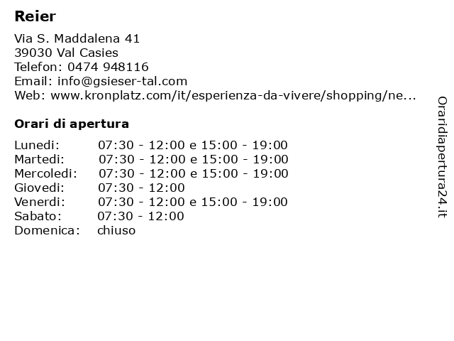 1 Reier Maria (distanza: 3,19 km) Localita Santa Maddalena Val 11a, 39030 Valle Di Casies alimentari, comm, dett, maria, prod, reier, vari 2 Reier Maria (distanza: 13,75 km) Via Stazione 10, 39035 Monguelfo-Tesido alberghi e hotel, hotel, maria, reier 3 Dott.ssa Reier Claudia (distanza: 27,34 km) Via Michael Pacher 14, 39030 Falzes ambulatorio, claudia, dott.ssa, medicina, medico, medico di famiglia, pediatra, reier, sanità, studio medico, visite 4 Dr.ssa Claudia Reier (distanza: 27,35 km) Piazza della Chiesa 2, 39030 Falzes (BZ) ambulatori, circoscrizione, claudia, dottore, dr.ssa, guarigione, medico di base, medico di famiglia, pediatra, reier, studi, visita 5 Gasthof Hotel Hofmann Restaurant (distanza: 0,14 km) Gasse 9, 39030 Santa Maddalena cibo, food, gasthof, gusto, hofmann, hotel, restaurant, risto 6 Despar (distanza: 12,25 km) Via Stazione 1, 39039 Villabassa alimentari, cibo, despar, frutta, gastronomia, panificio, supermercato, verdura |