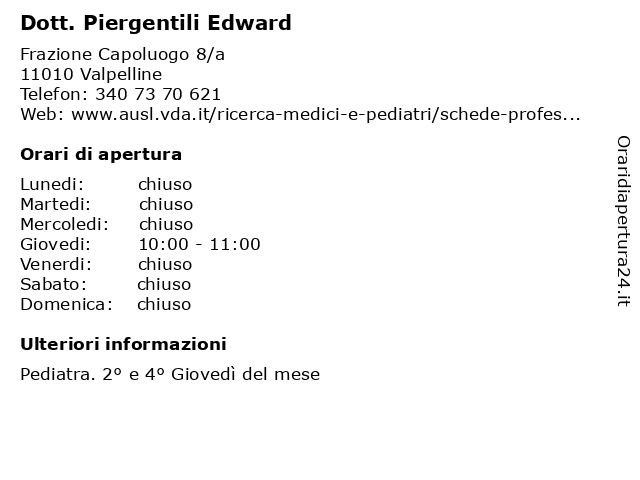 1 Dott. Piergentili Edward (distanza: 9,73 km) Località Grand Chemin 14, 11020 Saint-Christophe ambulatorio, dott., edward, medicina, medico, medico di famiglia, pediatra, piergentili, sanità, studio medico, visite 2 Ambulatorio Pediatrico (Dr. Piergentili) (distanza: 36,52 km) Via della Stazione 2, 11029 Verrès (dr., ambulatorio, ambulatorio pediatra libera scelta, ambulatorio pediatrico, assistenza medica per i bambini, cura, dottore, dottoressa, età evolutiva e dell'adolescenza, pazienti, pediatra, pediatrico, piergentili), servizio sanitario, tra 0 e 14 anni, tutela dell'infanzia, visite 3 Piergentili Edward (distanza: 36,52 km) Via della Stazione 2, 11100 Verres (AO) edward, piergentili, studi animali, veterinari 4 Ambulatorio Pediatrico (Dr. Piergentili) (distanza: 41,64 km) C/o ambulatorio comunale snc, 11020 Hône (dr., ambulatorio, ambulatorio pediatra libera scelta, ambulatorio pediatrico, assistenza medica per i bambini, cura, dottore, dottoressa, età evolutiva e dell'adolescenza, pazienti, pediatra, pediatrico, piergentili), servizio sanitario, tra 0 e 14 anni, tutela dell'infanzia, visite 5 Ambulatorio Pediatrico (Dr. Piergentili) (distanza: 42,98 km) C/o ambulatorio comunale snc, 11025 Gressoney-Saint-Jean (dr., ambulatorio, ambulatorio pediatra libera scelta, ambulatorio pediatrico, assistenza medica per i bambini, cura, dottore, dottoressa, età evolutiva e dell'adolescenza, pazienti, pediatra, pediatrico, piergentili), servizio sanitario, tra 0 e 14 anni, tutela dell'infanzia, visite 6 Ambulatorio Pediatrico (Dr. Piergentili) (distanza: 45,08 km) C/o Poliambulatorio snc, 11020 Donnas (dr., ambulatorio, ambulatorio pediatra libera scelta, ambulatorio pediatrico, assistenza medica per i bambini, cura, dottore, dottoressa, età evolutiva e dell'adolescenza, pazienti, pediatra, pediatrico, piergentili), servizio sanitario, tra 0 e 14 anni, tutela dell'infanzia, visite |