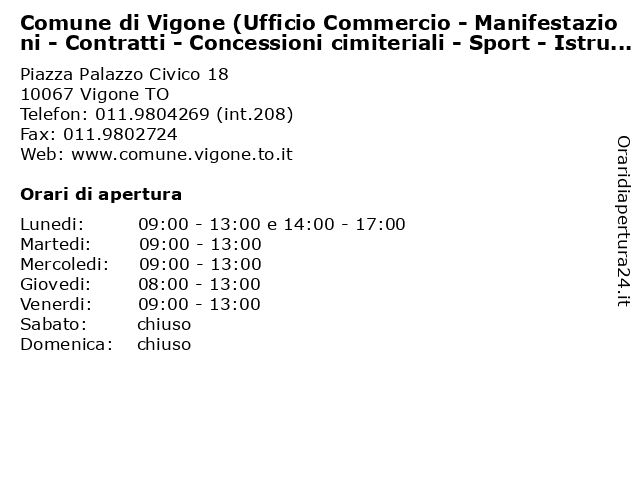 | Lunedi | 09:00-13:00 e 14:00-17:00 |