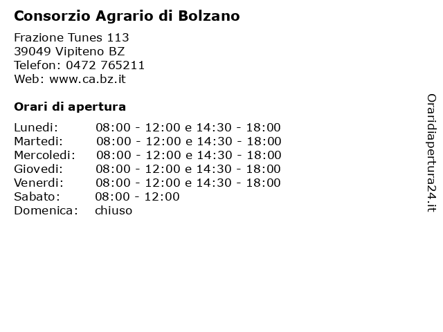 1 Consorzio Agrario di Bolzano (distanza: 17,99 km) Via dei Legnai 12-14, 39015 San Leonardo in Passiria (BZ) agrario, bolzano, consorzio, di, servizi, utente varie 2 Consorzio Agrazio di Bolzano (distanza: 0,50 km) Via Tunes 113, 39049 Vipiteno accessori, agrazio, attrezzature, bolzano, bricolage, consorzio, di, mangimi per animali, prodotti per agricoltura, prodotti per giardino 3 Provincia Bolzano - Ufficio del libro fondiario di Vipiteno (distanza: 0,75 km) via S. Margherita 6, 39049 Vipiteno bolzano, cittadino, del, di, fondiario, libro, provincia, servizi, ufficio, vipiteno 4 Banca di Trento e Bolzano (Bancomat) (distanza: 1,34 km) Via Stazione 1, 39049 Vipiteno BZ (bancomat), banca, banca di trento e bolzano, bancomat, bolzano, di, trento 5 Provincia Bolzano - Ufficio risparmio energetico (2° mercoledì del mese ) (distanza: 1,36 km) Città Nuova 21, 39049 Vipiteno (2°, bolzano, cittadino, del, energetico, mercoledì, mese, provincia, risparmio, servizi, ufficio 6 Istituto Edilizia Sociale Provincia Autonoma di Bolzano (distanza: 1,36 km) Città Nuova 21, 39049 Vipiteno autonoma, bolzano, comune, di, edilizia, istituto, provincia, servizi, sociale |