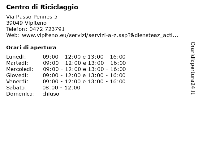 1 Centro miniriciclaggio Mezzaselva (distanza: 14,01 km) Via Molino snc, 39045 Mezzaselva - Fortezza centro, centro di riciclaggio, comune, fortezza, mezzaselva, miniriciclaggio, riciclaggio, servizi comunali, uffici comunali 2 Comune di Moso in Passiria - Centro di riciclaggio (distanza: 20,73 km) Località Paese 78, 39013 Moso in Passiria centro, centro di riciclaggio, comune, di, in, moso, moso in passiria, passiria, riciclaggio, servizi comunali, uffici comunali 3 Centro di Riciclaggio (distanza: 28,62 km) Via Tiso s.n.c., 39040 Funes centro, di, ecocentro, riciclaggio, riciclo 4 Centro di Riciclaggio (orario invernale) (distanza: 32,90 km) Via San Pietro s.n.c., 39040 Funes (orario, centro, di, ecocentro, invernale), riciclaggio, riciclo 5 Centro di Riciclaggio (orario estivo) (distanza: 32,90 km) Via San Pietro s.n.c., 39040 Funes (orario, centro, di, ecocentro, estivo), riciclaggio, riciclo 6 Centro di riciclaggio (distanza: 33,57 km) Via Prati Nuovi 12, 39020 Marlengo centro, di, ecocentro, riciclaggio, riciclo |