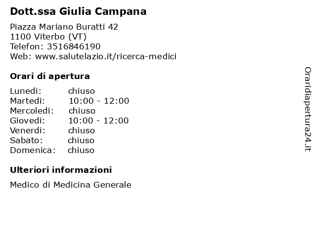| 1 Dott.ssa Giulia Campana (distanza: 6,17 km) Via Monfalcone 2, 01100 Viterbo (VT) ambulatori, analisi, campana, cura della persona, cure, dott.ssa, giulia, medici, medicina, sanità, visite mediche 2 Cusi Giulia (distanza: 4,98 km) Via Carlo Cattaneo 34, 01100 Viterbo bar, birrerie, cusi, giulia, paninoteche 3 Credipass Giuliano Campana (distanza: 6,68 km) Via Igino Garbini 82, 01100 Viterbo banche, calistroni, campana, claudio, credipass, finanziamenti, giuliano, mediazione creditizia, prestiti, servizi finanziari 4 Parcheggio a Pagamento Via Campana (Orario Estivo) (distanza: 11,35 km) Via Campana s.n.c., 01037 Ronciglione (orario, campana, estivo), pagamento, parcheggio, parcheggio a pagamento, sosta auto, sosta mezzi, via 5 Parcheggio a Pagamento Via Campana (Orario Invernale) (distanza: 11,35 km) Via Campana s.n.c., 01037 Ronciglione (orario, campana, invernale), pagamento, parcheggio, parcheggio a pagamento, sosta auto, sosta mezzi, via 6 Officina Campana Fabio (distanza: 13,25 km) Via dell'Uliveto 10, 01039 Vignanello campana, centro montaggio gomme, fabio, officina, vendita pneumatici |