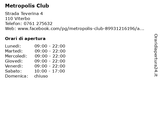 1 Metropolis Club (distanza: 0,00 km) Strada Teverin 4, 01100 Viterbo (VT) abbigliamento, club, cosmetici, metropolis, profumo, scarpe 2 Metropolis Di Borgonovo Antonella (distanza: 46,50 km) Via Pietro Gori 16, 05100 Terni antonella, borgonovo, comm, dett, metropolis, mobili 3 Metropolis Arredamenti (distanza: 46,52 km) Via della Rinascita 9, 05100 Terni (TR) arredamenti, biancheria casa, casalinghi, metropolis 4 Metropolis di Borgonovo Antonella (distanza: 46,83 km) Via Gori P. 16/b, 05100 Terni antonella, borgonovo, metropolis 5 Palestra Lux (orario estivo) (distanza: 0,98 km) Viale Trento 9/A, 01100 Viterbo (VT) (orario, estivo), ginnastica posturale, lux, palestra 6 Egň club ssd r.l. (distanza: 2,59 km) Via O. benedetti 23, 01100 Viterbo club, egň, fitness, palestra, r.l., ssd  |