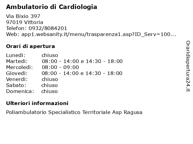 1 Ospedale Guzzardi - Cardiologia • Visite ai Degenti (distanza: 0,95 km) Via Papa Giovanni XXIII° sn, 97019 Vittoria (RG) ai, ambulatorio, assistenza, cardiologia, cure mediche, degenti, guzzardi, ospedale, sanità, servizi ai cittadini, visite 2 Ospedale Guzzardi - Cardiologia • Ambulatorio (distanza: 0,95 km) Via Papa Giovanni XXIII° sn, 97019 Vittoria (RG) ambulatorio, assistenza, cardiologia, cure mediche, guzzardi, ospedale, sanità, servizi ai cittadini 3 Ospedale Maria Paternò Arezzo - Cardiologia e Utic: Visite ai Degenti (distanza: 1,33 km) Contrada Rito s.n.c., 97100 Ragusa ai, ambulatorio, arezzo, assistenza, cardiologia, cure mediche, degenti, maria, ospedale, paternò, sanità, servizi ai cittadini, utic, visite 4 Ospedale Maria Paternò Arezzo - Cardiologia e Utic: Ambulatorio Controllo PM e AICD (distanza: 1,33 km) Contrada Rito s.n.c., 97100 Ragusa aicd, ambulatorio, arezzo, assistenza, cardiologia, controllo, cure mediche, maria, ospedale, paternò, pm, sanità, servizi ai cittadini, utic 5 Ospedale Maria Paternò Arezzo - Cardiologia e Utic: Ambulatorio Test Ergometrico (distanza: 1,33 km) Contrada Rito s.n.c., 97100 Ragusa ambulatorio, arezzo, assistenza, cardiologia, cure mediche, ergometrico, maria, ospedale, paternò, sanità, servizi ai cittadini, test, utic 6 Ospedale Guzzardi - Cardiologia: Visita ai Degenti (distanza: 1,46 km) Via Papa Giovanni XXIII° s.n.c., 97019 Vittoria ai, ambulatorio, assistenza, cardiologia, cure mediche, degenti, guzzardi, ospedale, sanità, servizi ai cittadini, visita |