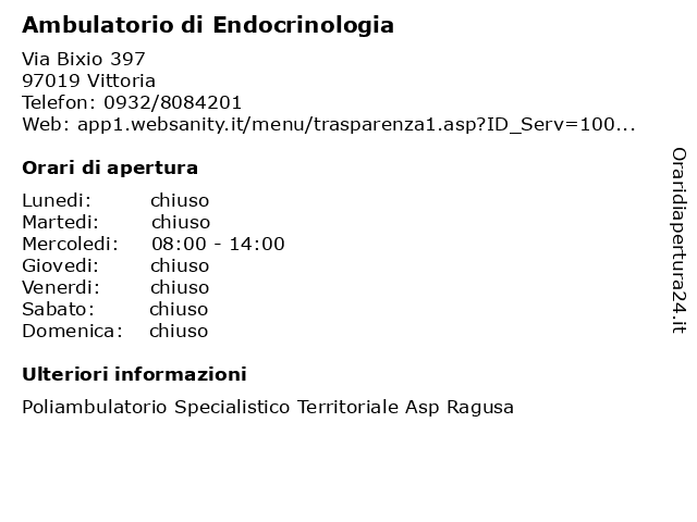 1 Ospedale Guzzardi - Medicina • Ambulatorio di Endocrinologia (distanza: 0,95 km) Via Papa Giovanni XXIII° sn, 97019 Vittoria (RG) ambulatorio, assistenza, cure mediche, di, endocrinologia, guzzardi, medicina, ospedale, sanità, servizi ai cittadini 2 Ospedale Maria Paternò Arezzo - Pediatria: Ambulatorio Endocrinologia (distanza: 1,33 km) Contrada Rito s.n.c., 97100 Ragusa ambulatorio, arezzo, assistenza, cure mediche, endocrinologia, maria, ospedale, paternò, pediatria, sanità, servizi ai cittadini 3 Ospedale Guzzardi - Medicina: Ambulatorio Endocrinologia (distanza: 1,46 km) Via Papa Giovanni XXIII° s.n.c., 97019 Vittoria ambulatorio, assistenza, cure mediche, endocrinologia, guzzardi, medicina, ospedale, sanità, servizi ai cittadini 4 Ospedale Civile - Medicina Interna: Ambulatorio di Endocrinologia (distanza: 6,35 km) Piazza Caduti di Nassirya 1, 97100 Ragusa ambulatorio, assistenza, civile, cure mediche, di, endocrinologia, interna, medicina, ospedale, sanità, servizi ai cittadini 5 Ospedale Regina Margherita - Medicina: Ambulatorio Endocrinologia (distanza: 7,45 km) Contrada Mastrella s.n.c., 97013 Comiso ambulatorio, assistenza, cure mediche, endocrinologia, margherita, medicina, ospedale, regina, sanità, servizi ai cittadini 6 Poliambulatorio Distrettuale - Endocrinologia (distanza: 13,83 km) Via G. di Vittorio 3, 97017 Santa Croce Camerina ambulatorio, assistenza, cure mediche, distrettuale, endocrinologia, poliambulatorio, sanità, servizi ai cittadini |