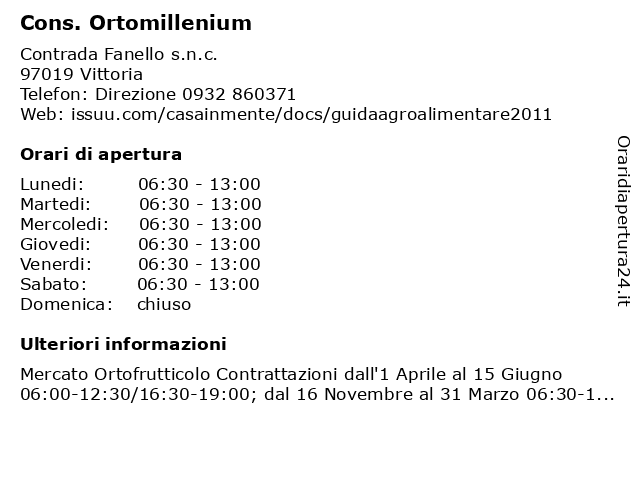 1 Cons. Ortomillenium (Orario Contrattazioni dal 16/6 al 15/11) (distanza: 2,66 km) Contrada Fanello snc, 97019 Vittoria (orario, 15/11), 16/6, al, cons., contrattazioni, dal, mercato ortofrutticolo, ortofrutticolo, ortomillenium, verdure 2 Cons. Ortomillenium (Orario Contrattazioni dal 1/4 al 15/6) (distanza: 2,66 km) Contrada Fanello snc, 97019 Vittoria (orario, 1/4, 15/6), al, cons., contrattazioni, dal, mercato ortofrutticolo, ortofrutticolo, ortomillenium, verdure 3 Cons. Ortomillenium (Orario Contrattazioni dal 16/11 al 31/3) (distanza: 2,66 km) Contrada Fanello snc, 97019 Vittoria (orario, 16/11, 31/3), al, cons., contrattazioni, dal, mercato ortofrutticolo, ortofrutticolo, ortomillenium, verdure 4 Confeserfidi Soc. Cons. a r. l. (distanza: 2,75 km) Via Rosario Cancellieri 102, 97019 Vittoria agevolati, confeser, confeserfidi, cons., fidi, finanziamenti, imprese, l., r., soc. 5 Confeserfidi Soc. Cons. a r. l. (distanza: 8,59 km) Via Generale Amato 102, 97013 Comiso agevolati, confeser, confeserfidi, cons., fidi, finanziamenti, imprese, l., r., soc. 6 Confeserfidi Soc. Cons. a r. l. (distanza: 19,75 km) Via Giorgio Perlasca 16/B, 97100 Ragusa agevolati, confeser, confeserfidi, cons., fidi, finanziamenti, imprese, l., r., soc. |