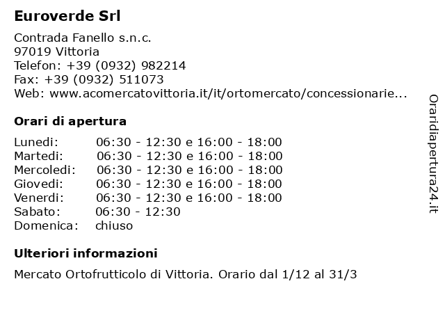 1 Euroverde Srl (distanza: 0,00 km) Contrada Fanello s.n.c., 97019 Vittoria euroverde, frutta, ortofrutta, prodotti freschi, srl, verdura 2 Euroverde Srl (distanza: 0,00 km) Contrada Fanello s.n.c., 97019 Vittoria acquisti, alimenti, convenienza, euroverde, mercato, ortofrutta, shopping, spesa, srl 3 Euroverde Srl (distanza: 2,66 km) Contrada Fanello snc, 97019 Vittoria agricoltura, euroverde, ingrosso, mercato, ortofrutta, spesa, srl 4 Euroverde srl (Orario Contrattazioni dal 16/6 al 15/11) (distanza: 2,66 km) Contrada Fanello snc, 97019 Vittoria (orario, 15/11), 16/6, al, contrattazioni, dal, euroverde, mercato ortofrutticolo, ortofrutticolo, srl, verdure 5 Euroverde srl (Orario Contrattazioni dal 1/4 al 15/6) (distanza: 2,66 km) Contrada Fanello snc, 97019 Vittoria (orario, 1/4, 15/6), al, contrattazioni, dal, euroverde, mercato ortofrutticolo, ortofrutticolo, srl, verdure 6 |