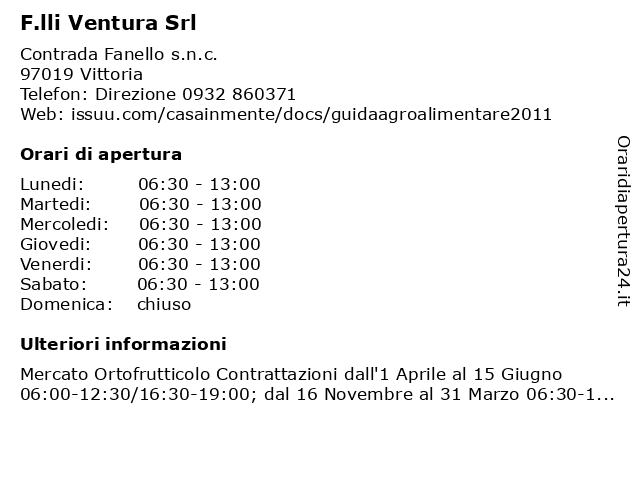 1 F.lli Ventura srl (Orario Contrattazioni dal 16/6 al 15/11) (distanza: 2,66 km) Contrada Fanello snc, 97019 Vittoria (orario, 15/11), 16/6, al, contrattazioni, dal, f.lli, mercato ortofrutticolo, ortofrutticolo, srl, ventura, verdure 2 F.lli Ventura srl (Orario Contrattazioni dal 16/11 al 31/3) (distanza: 2,66 km) Contrada Fanello snc, 97019 Vittoria (orario, 16/11, 31/3), al, contrattazioni, dal, f.lli, mercato ortofrutticolo, ortofrutticolo, srl, ventura, verdure 3 F.lli Ventura srl (Orario Contrattazioni dal 1/4 al 15/6) (distanza: 2,66 km) Contrada Fanello snc, 97019 Vittoria (orario, 1/4, 15/6), al, contrattazioni, dal, f.lli, mercato ortofrutticolo, ortofrutticolo, srl, ventura, verdure 4 Venimm Di Ventura s. e Catalano n. Ss (distanza: 8,71 km) Via Leonardo Sciascia 29, 97013 Comiso affitto, catalano, immob, proprietà, venimm, ventura 5 Ventura Marco (distanza: 16,19 km) Via Eugenio Criscione Lupis 159, 97100 Ragusa edicole, giornalai, marco, ventura 6 Studio Ventura Associati (distanza: 17,07 km) Contrada cirito snc, 97012 Chiaramonte Gulfi agrimensore, associati, studio, ventura |