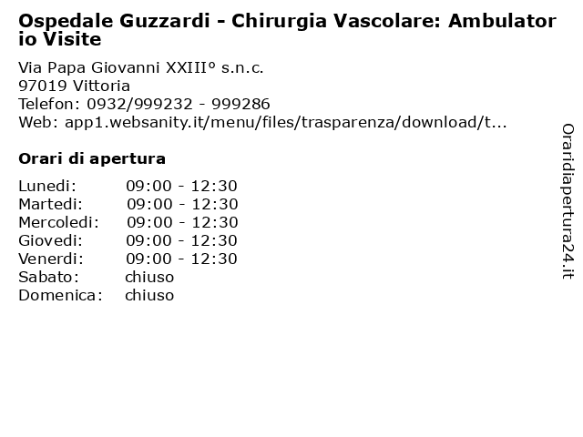 1 Ospedale Guzzardi - Direzione Sanitaria (distanza: 0,00 km) Via Papa Giovanni XXIII° s.n.c., 97019 Vittoria ambulatorio, assistenza, cure mediche, direzione, guzzardi, ospedale, sanitaria, sanità, servizi ai cittadini 2 Ospedale Guzzardi - Ufficio Relazioni con il Pubblico (distanza: 0,00 km) Via Papa Giovanni XXIII° s.n.c., 97019 Vittoria ambulatorio, assistenza, con, cure mediche, guzzardi, il, ospedale, pubblico, relazioni, sanità, servizi ai cittadini, ufficio 3 Ospedale Guzzardi - Archivio Clinico (distanza: 0,00 km) Via Papa Giovanni XXIII° s.n.c., 97019 Vittoria ambulatorio, archivio, assistenza, clinico, cure mediche, guzzardi, ospedale, sanità, servizi ai cittadini 4 Ospedale Guzzardi - Ufficio Ticket (distanza: 0,00 km) Via Papa Giovanni XXIII° s.n.c., 97019 Vittoria ambulatorio, assistenza, cure mediche, guzzardi, ospedale, sanità, servizi ai cittadini, ticket, ufficio 5 Ospedale Guzzardi - CUP Centro Unico di Prenotazione (distanza: 0,00 km) Via Papa Giovanni XXIII° s.n.c., 97019 Vittoria ambulatorio, assistenza, centro, cup, cure mediche, di, guzzardi, ospedale, prenotazione, sanità, servizi ai cittadini, unico 6 Ospedale Guzzardi - Servizio Sociale (distanza: 0,00 km) Via Papa Giovanni XXIII° s.n.c., 97019 Vittoria ambulatorio, assistenza, cure mediche, guzzardi, ospedale, sanità, servizi ai cittadini, servizio, sociale |