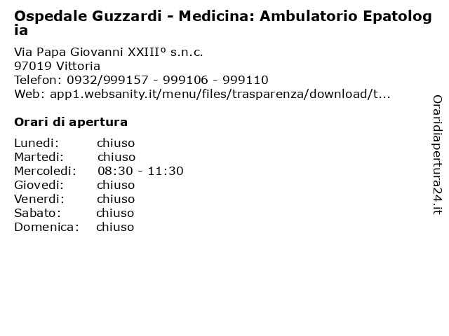 1 Ospedale Guzzardi - Direzione Sanitaria (distanza: 0,00 km) Via Papa Giovanni XXIII° s.n.c., 97019 Vittoria ambulatorio, assistenza, cure mediche, direzione, guzzardi, ospedale, sanitaria, sanità, servizi ai cittadini 2 Ospedale Guzzardi - Ufficio Relazioni con il Pubblico (distanza: 0,00 km) Via Papa Giovanni XXIII° s.n.c., 97019 Vittoria ambulatorio, assistenza, con, cure mediche, guzzardi, il, ospedale, pubblico, relazioni, sanità, servizi ai cittadini, ufficio 3 Ospedale Guzzardi - Archivio Clinico (distanza: 0,00 km) Via Papa Giovanni XXIII° s.n.c., 97019 Vittoria ambulatorio, archivio, assistenza, clinico, cure mediche, guzzardi, ospedale, sanità, servizi ai cittadini 4 Ospedale Guzzardi - Ufficio Ticket (distanza: 0,00 km) Via Papa Giovanni XXIII° s.n.c., 97019 Vittoria ambulatorio, assistenza, cure mediche, guzzardi, ospedale, sanità, servizi ai cittadini, ticket, ufficio 5 Ospedale Guzzardi - CUP Centro Unico di Prenotazione (distanza: 0,00 km) Via Papa Giovanni XXIII° s.n.c., 97019 Vittoria ambulatorio, assistenza, centro, cup, cure mediche, di, guzzardi, ospedale, prenotazione, sanità, servizi ai cittadini, unico 6 Ospedale Guzzardi - Servizio Sociale (distanza: 0,00 km) Via Papa Giovanni XXIII° s.n.c., 97019 Vittoria ambulatorio, assistenza, cure mediche, guzzardi, ospedale, sanità, servizi ai cittadini, servizio, sociale |