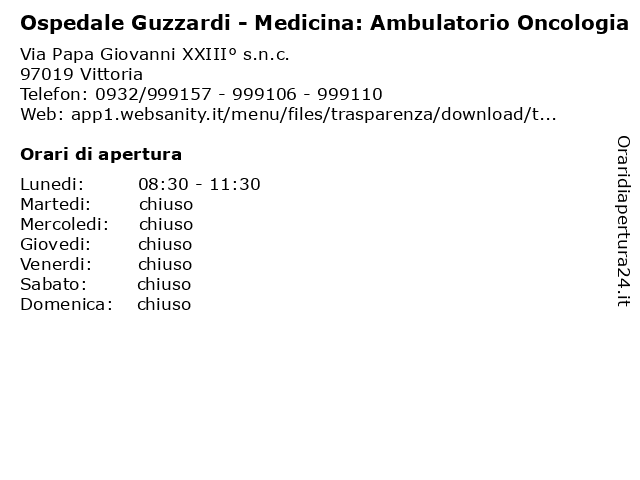 1 Ospedale Guzzardi - Direzione Sanitaria (distanza: 0,00 km) Via Papa Giovanni XXIII° s.n.c., 97019 Vittoria ambulatorio, assistenza, cure mediche, direzione, guzzardi, ospedale, sanitaria, sanità, servizi ai cittadini 2 Ospedale Guzzardi - Ufficio Relazioni con il Pubblico (distanza: 0,00 km) Via Papa Giovanni XXIII° s.n.c., 97019 Vittoria ambulatorio, assistenza, con, cure mediche, guzzardi, il, ospedale, pubblico, relazioni, sanità, servizi ai cittadini, ufficio 3 Ospedale Guzzardi - Archivio Clinico (distanza: 0,00 km) Via Papa Giovanni XXIII° s.n.c., 97019 Vittoria ambulatorio, archivio, assistenza, clinico, cure mediche, guzzardi, ospedale, sanità, servizi ai cittadini 4 Ospedale Guzzardi - Ufficio Ticket (distanza: 0,00 km) Via Papa Giovanni XXIII° s.n.c., 97019 Vittoria ambulatorio, assistenza, cure mediche, guzzardi, ospedale, sanità, servizi ai cittadini, ticket, ufficio 5 Ospedale Guzzardi - CUP Centro Unico di Prenotazione (distanza: 0,00 km) Via Papa Giovanni XXIII° s.n.c., 97019 Vittoria ambulatorio, assistenza, centro, cup, cure mediche, di, guzzardi, ospedale, prenotazione, sanità, servizi ai cittadini, unico 6 Ospedale Guzzardi - Servizio Sociale (distanza: 0,00 km) Via Papa Giovanni XXIII° s.n.c., 97019 Vittoria ambulatorio, assistenza, cure mediche, guzzardi, ospedale, sanità, servizi ai cittadini, servizio, sociale |