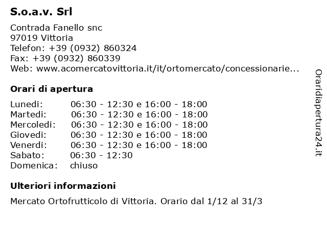 1 S.o.a.v. Srl (distanza: 2,66 km) Contrada Fanello s.n.c., 97019 Vittoria frutta, ortofrutta, prodotti freschi, s.o.a.v., srl, verdura 2 S.o.a.v. Srl (distanza: 2,66 km) Contrada Fanello s.n.c., 97019 Vittoria acquisti, alimenti, convenienza, mercato, ortofrutta, s.o.a.v., shopping, spesa, srl 3 S.o.a.v. Srl (distanza: 2,66 km) Contrada Fanello s.n.c., 97019 Vittoria acquisti, alimenti, convenienza, mercato, ortofrutta, s.o.a.v., shopping, spesa, srl 4 Mercato Ortofrutticolo di Vittoria (Orario dal 1/12 al 31/3) (distanza: 0,00 km) Contrada Fanello snc, 97019 Vittoria (orario, 1/12, 31/3), agricoltura, al, dal, di, ingrosso, mercato, ortofrutta, ortofrutticolo, spesa, vittoria 5 New Flowers (distanza: 0,90 km) Via La Marmora 363, 97019 Vittoria commercio all’ingrosso, flowers, new, vivaio all'ingrosso 6 Bapi Supermercati srl - Orario Invernale - (distanza: 1,27 km) Via Mattei 17/C, 97019 Vittoria (RG) alimentari - produzione e ingrosso, alimentari - vendita al dettaglio, bapi, casalinghi, invernale, orario, srl, supermercati |