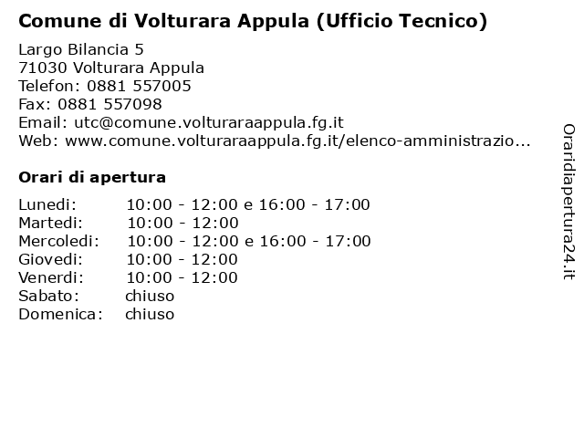 1 Comune di Volturara Appula (Ufficio Relazioni con il Pubblico) (distanza: 0,00 km) Largo Bilancia 5, 71030 Volturara Appula (ufficio, appula, comune, con, di, il, pubblico), relazioni, uffici comunali volturara appula, volturara, volturara appula comune 2 Comune di Volturino (Ufficio Affari Generali) (distanza: 7,45 km) Via della Fontana Vecchia 1, 71030 Volturino FG (ufficio, affari, comune, di, generali), uffici comunali volturino, volturino, volturino comune 3 Comune di Castelfranco in Miscano (Ufficio Polizia Municipale) (distanza: 22,32 km) Viale Roma 12, 82022 Castelfranco in Miscano (ufficio, amministrazione, amministrazione trasparente, assessore, castelfranco, comunale, comune, di, giunta comunale, in, miscano, municipale), polizia, pratiche comunali, sindaco, sportello, ufficio comunale 4 Comune di Castelfranco in Miscano (Settore Tecnico : Cimitero, Gestione e manutenzione patrimonio immobiliare, pubblica illuminazione, ambiente, edilizia privata, urbanistica, Lavori pubblici; CED) (distanza: 22,32 km) Viale Roma 12, 82022 Castelfranco in Miscano (settore, ambiente, amministrazione, amministrazione trasparente, assessore, castelfranco, ced, ced), ced;, cimitero, comunale, comunali, comune, di, edilizia, gestione, giunta comunale, idrico), illuminazione, immobiliare, in, lavori, manutenzione, miscano, patrimonio, pratiche comunali, privata, pubblica, pubblici;, rifiuti;, servizi, servizio, settore, tecnico, urbanistica 5 Comune di Castelfranco in Miscano (Segreteria Comunale) (distanza: 22,32 km) Viale Roma 12, 82022 Castelfranco in Miscano (BN) (responsabile, (segreteria, castelfranco, certificati, comunale, comunale), comunali, comune, contabilità, di, in, miscano, modulistica, municipio, ragioneria, segretario, segreteria, servizi, servizi ai cittadini, tasse 6 Comune di Bonefro (Servizi e Uffici comunali) (distanza: 25,05 km) Via XX Settembre 98, 86041 Bonefro (servizi, amministrazione, amministrazione trasparente, assessore, bonefro, comunale, comunali), comune, di, giunta comunale, pratiche comunali, sindaco, sportello, uffici, ufficio comunale |